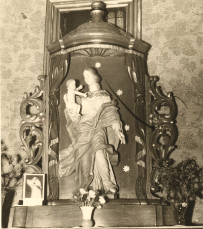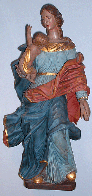 Die Madonna aus der Kapelle St.Balbina im Rade befand sich 1960 in Privatbesitz eines Frl. H. auf der Gartenstraße in Süchteln. Beim Abbruch der Kapelle 1803 war die Madonna von einer Familie, die in der Nähe wohnte, angenommen und dort aufbewahrt worden. Die Statue war durch einen volkstümlich-frommen Stil ausgezeichnet und trotz ihres hohen Alters unversehrt. Die Gottesmutter stand vor einem mit goldenen Sternen übersäten blauen Hintergrund, den Jesusknaben auf der Hand haltend. Darüber wölbte sich ein Baldachin. Die ganze Form und die in zarten Tönen gehaltenen Farben kennzeichneten den Geist und die Religiösität einer anderen, längst vergangenen Zeit. |