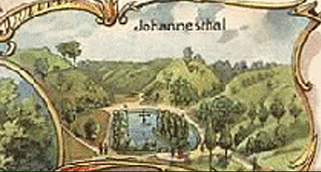 Einer anderen Überlieferung nach hat im Johannistal in grauer Vorzeit eine Burg gestanden. Der Burgherr, Ritter Johannes Balduinus, war weit und breit als Raubritter ebenso bekannt wie gefürchtet. Reisende Kaufleute, die ihre Ware hinüber nach Holland in Fuhrkolonnen schaffen wollten, wurden von dem Ritter mit seinem Troß oft überfallen und gänzlich ausgeraubt. Mit dem Raube zogen die Schnapphähne zur Burg des Ritters, wo dann wüste Zechgelage veranstaltet wurden. Während eines dieser Zechgelage zog ein schweres Gewitter herauf und entlud sich mit zuckenden Blitzen und gewaltigen Donnerschlägen über der Burg. Als plötzlich ein ohrenbetäubender Donnerschlag die Burg in ihren Grundmauern erschütterte und die Fensterscheiben erklirrten, wurden die Zechkumpanen des Ritters sehr kleinlaut und zitterten wie Espenlaub. Da forderte der Ritter sie mit einer abscheulichen Gotteslästerung zum Zechen auf. Kaum war die furchtbare Gotteslästerung seinen Lippen entschwunden, da fuhr ein greller Blitzstrahl in den Rittersaal und mit einem entsetzlichen Donnerschlag versank die Burg in die Tiefe. An der Stelle, wo die Burg gestanden hatte, bildete sich ein Weiher. |