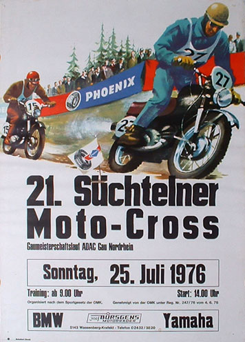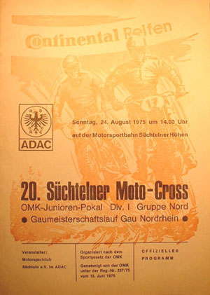 Beim 20. Süchtelner Moto-Cross 1975 gingen insgesamt 71 Fahrer in 2. Haupt- rennen an den Start. Der „Karl-Kluth-Gedächtnislauf“ war das 1. Hauptrennen in der Klasse 175 – 250 ccm und ging über 2 x 20 Min. + 2 Runden. Das 2. Haupt- rennen, der „Karl-Münster-Gedächtnislauf“ in der Klasse 350 – 500 ccm ging ebenfalls über 2 x 20 Min. + 2 Runden. Die Zuschauer sahen Spitzenfahrer auf Motorrädern von Maico, Husquarna, CZ, KTM, Ossa, Yamaha, Suzuki und Bultaco. Das freie Training begann um 9:00 Uhr und dauerte 2 Stunden, danach gab es von 11:15 bis 12:00 Uhr das „Pflicht-Training“ und ab 14:00 Uhr die Hauptrennen. Der wohl bekannteste Fahrer, der bereits Anfang der 1950er Jahre bei den ersten Rennen in Süchteln ( damals natürlich noch auf dem Motorrad ) an den Start ging, war der spätere Ferrari Pilot und erste deutsche Formel 1 Fahrer nach dem Krieg, Wolfgang Reichsgraf Berghe von Trips. |