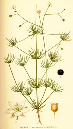 Der gemeine Spergel (Ackerspergel, Mariengras, Spergula arvensis L.), bisweilen 60-90 cm hoch, mit unterseits längsfurchigen Blättern, weißen Blüten und schwarzen, warzigen, schmalen Samen,