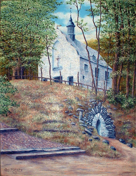 Conrad Schmitz 16.04.1875 - 23.05.1950 Inhaber einer „Kunstanstalt“, d.h. einer Gipsgießerei und Devotionalienfabrik, war als Maler Autodidakt, jedoch ein begabter. Auf Studienreisen nach Süddeutschland, Italien und in die Schweiz holte er seine Eindrücke, die dann in Zeichnungen und Ölbildern ihren Niederschlag fanden. Aber seine wahre Malerliebe gehörte Alt-Süchteln, u.v.a. das alte Rathaus, das letzte Stadttor, die brennende St. Clemens Kirche und der Heiligenberg mit der Irmgardis-Kapelle. Die zweite Liebe von Conrad Schmitz gehörte der Familie, die im Laufe der Jahre auf die stattliche Zahl von elf Kindern heranwuchs. Sein Talent konnte er dabei an zwei seiner Söhne, Hugo und Hermann, weitergeben. |