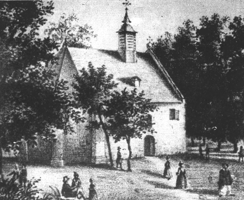 Durch die, auf dieser alten Lithographie gut erkennbare, SeitentĂŒre drangen die Diebe in die Irmgardis-Kapelle ein. |