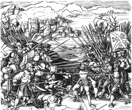 Zeitgenössische Darstellung einer Landsknechteschlacht im Dreißigjährigen Krieg |