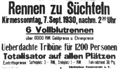 Der 1845 ins Leben gerufene Süchtelner Reit- und Rennverein begründete 1882 auf den Süchtelner Höhen einen provisorischen Rennplatz, auf dem man schon ein Jahr später recht professionelle Flachrennen, Hürdenrennen, Trabrennen und Ringstechen veranstaltete. In den Pausen gab es Volksbelustigungen wie Stangen- und Tonnenklettern sowie Sacklaufen. Die ersten Renntage auf den Süchtelner Höhen waren Volksfeste voll naiver Vergnügungen. Bald aber wollte der Verein höher hinaus. In den 1890er Jahren bemühte man sich um einen internationalen Anspruch der Süchtelner Rennen, stellte einen Totalisator ( Wettannahmestelle ) auf und strebte nach großstädtischem Flair. Um 1900 kamen die Rennsportfreunde von nah und fern zu den Renntagen. |